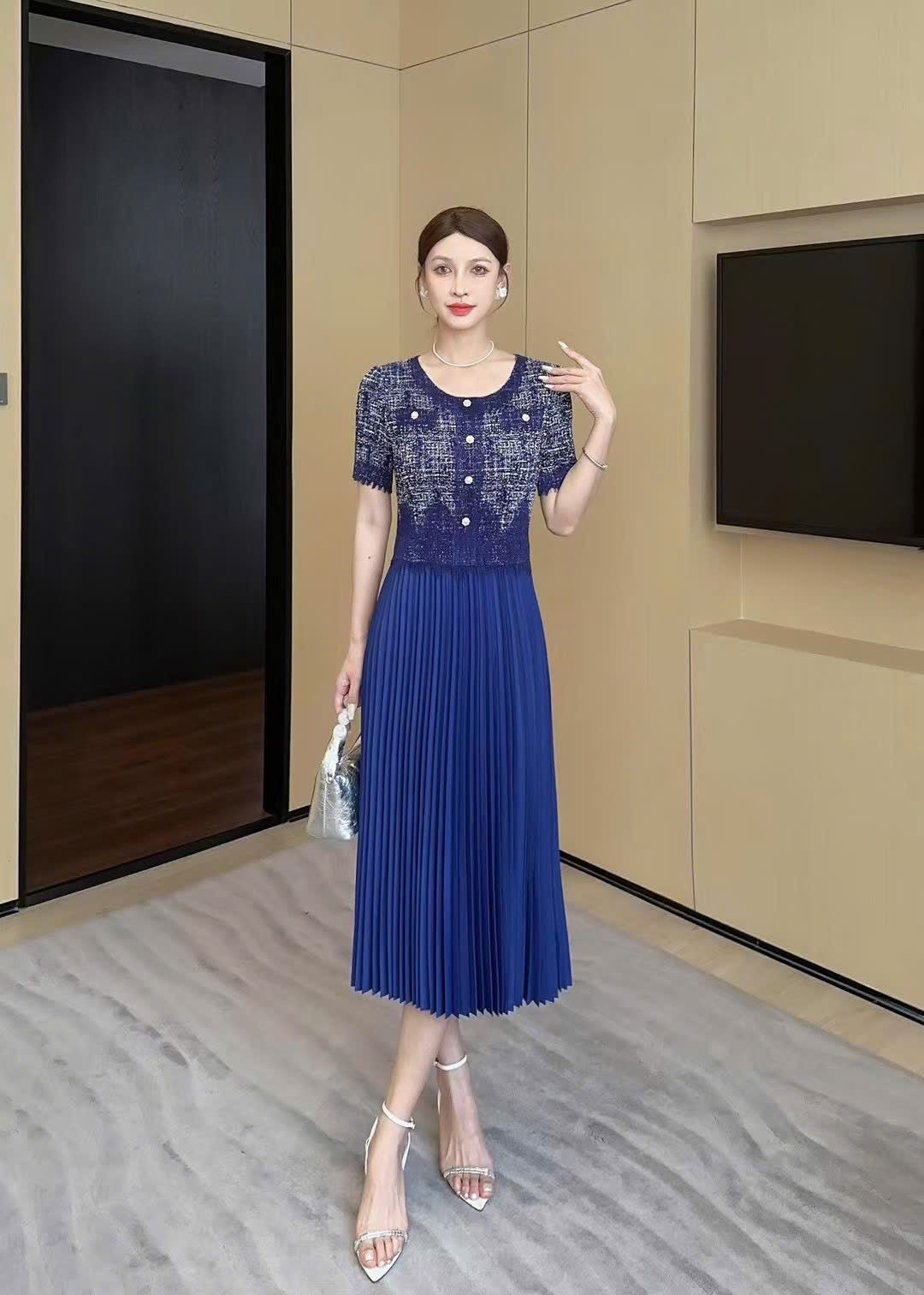 Đầm thun nhún xếp ly phối ren màu Xanh 6089