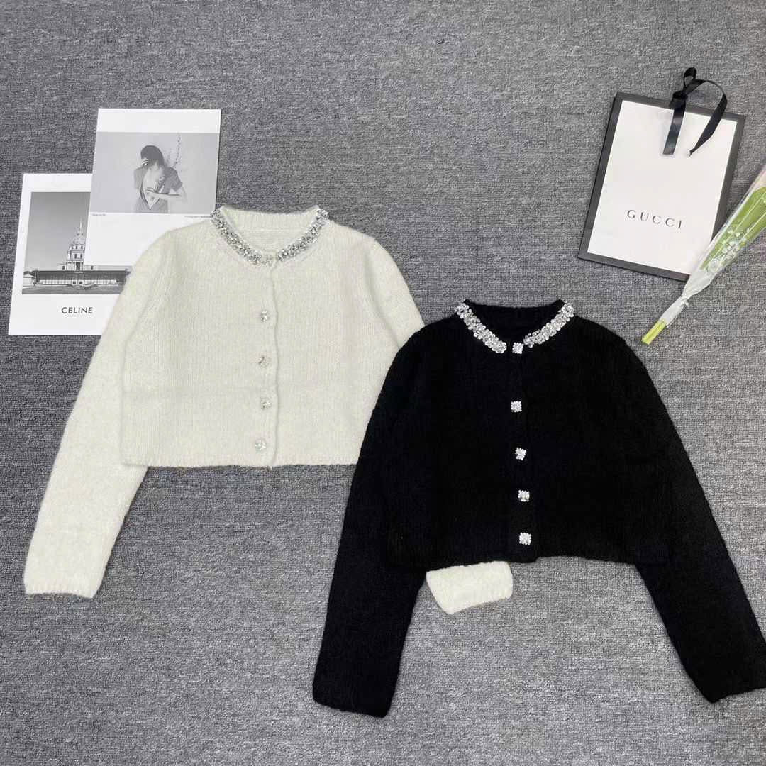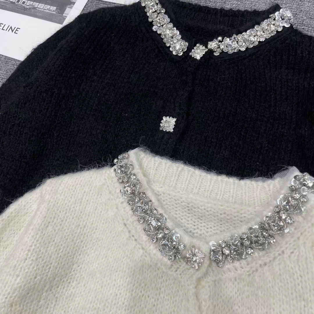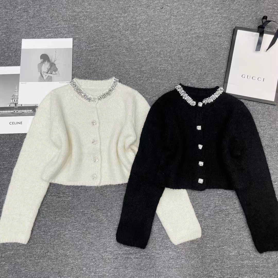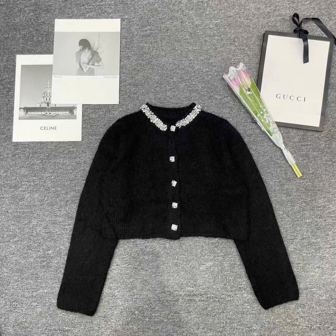 Áo khoác len lông đính đá cổ kèm nút đá màu đen 4861