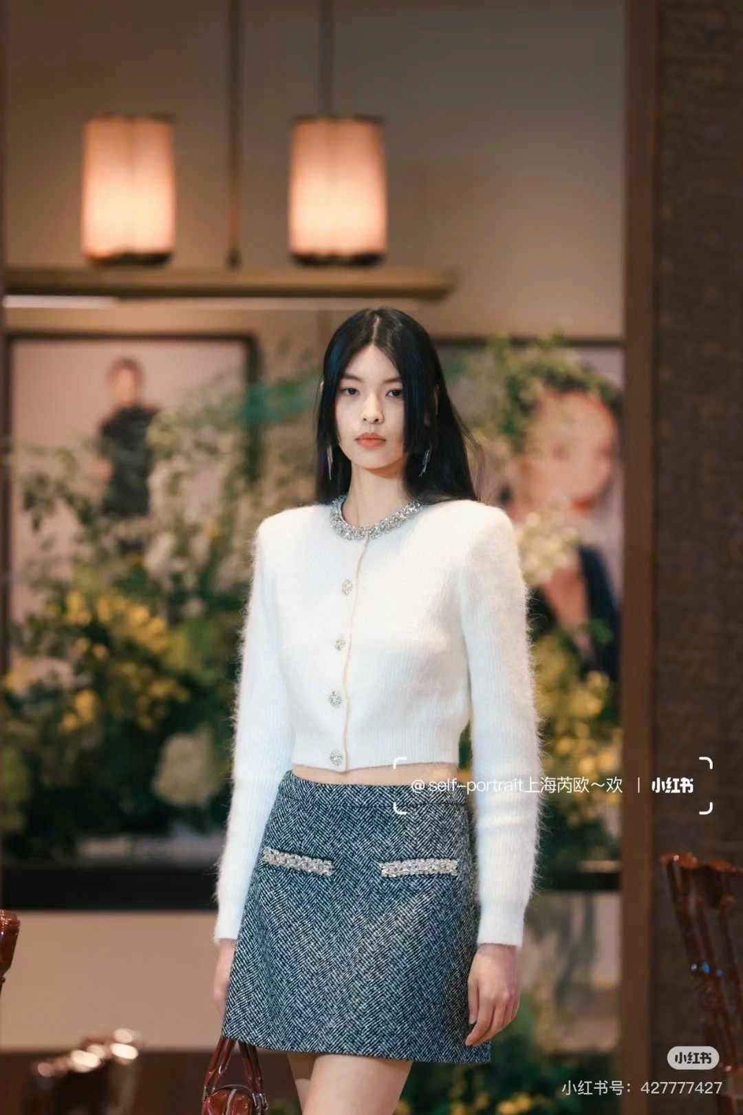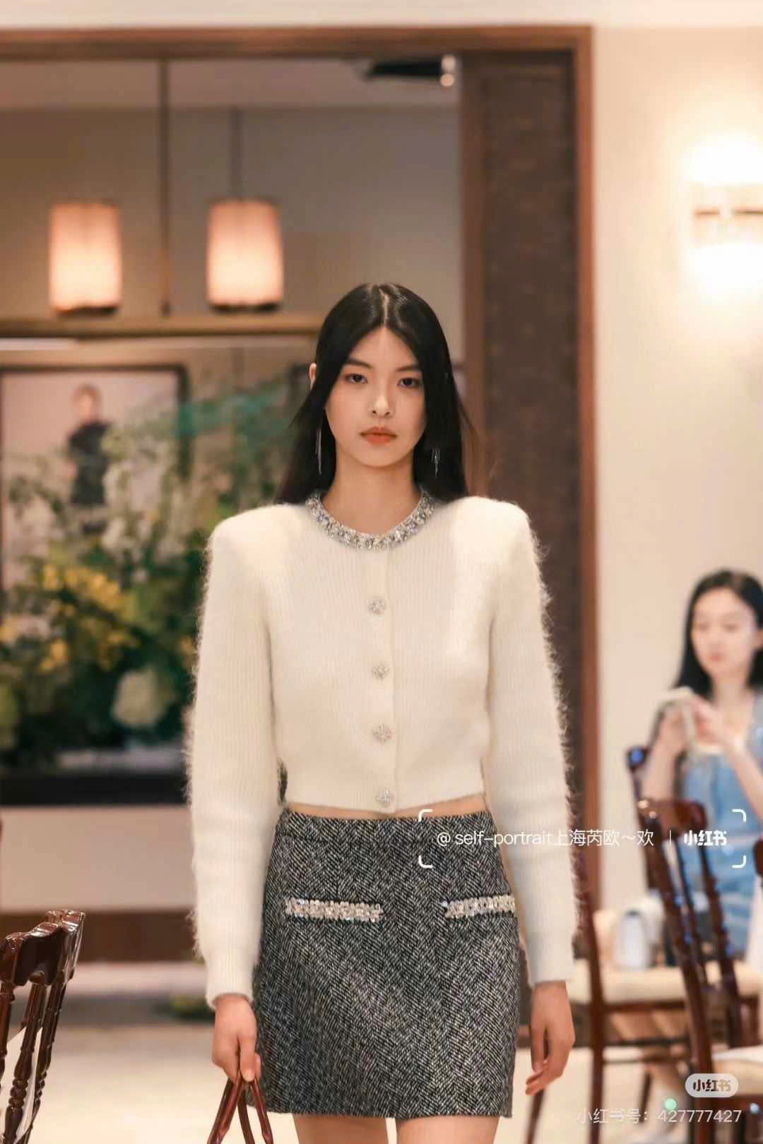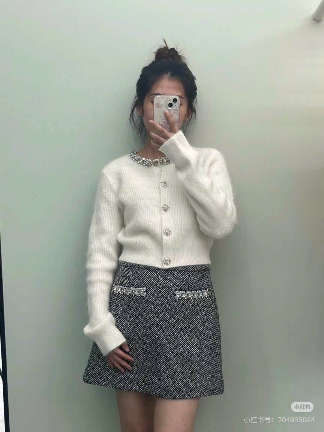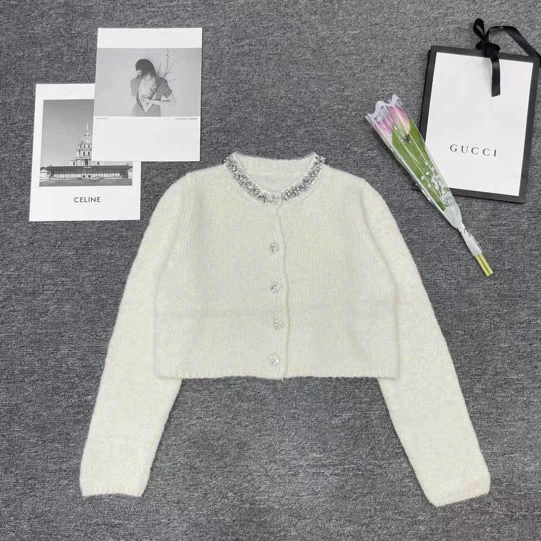 Áo khoác len lông đính đá cổ kèm nút đá màu đen 4861