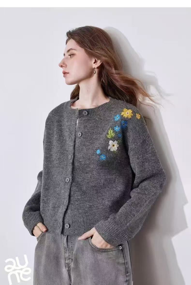 Áo khoác len thêu hoa ngực trái và lưng Màu Xám 6879