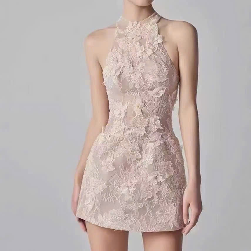 Đầm ren yếm xịn bông hoa nổi Màu Hồng 5965
