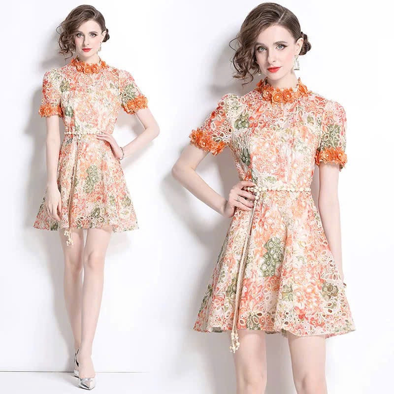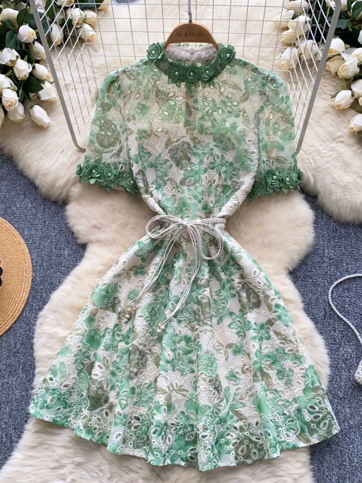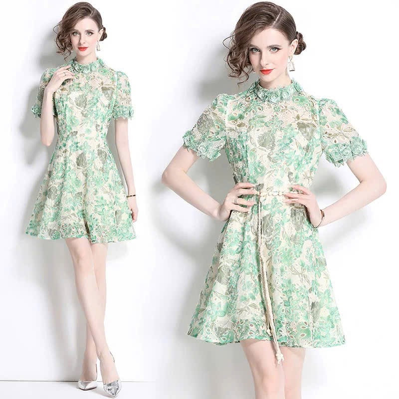 Đầm ren ngắn kèm dây belt bông màu xanh 6318