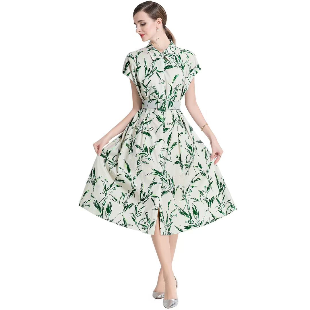 Đầm lụa kèm belt hoạ tiết xanh lá 6732