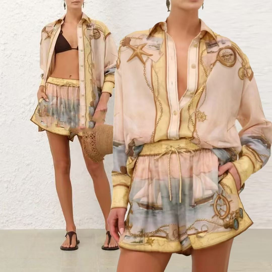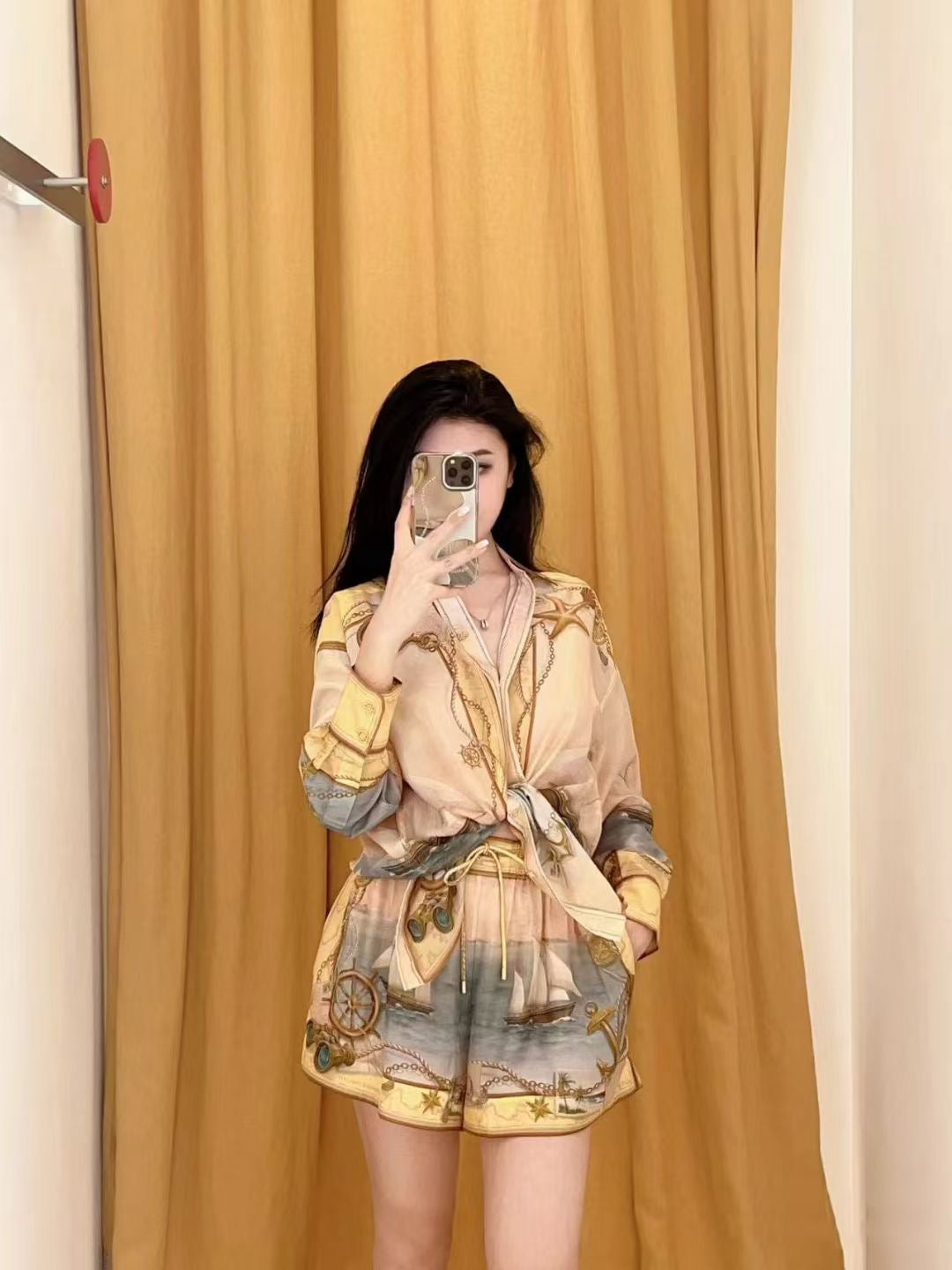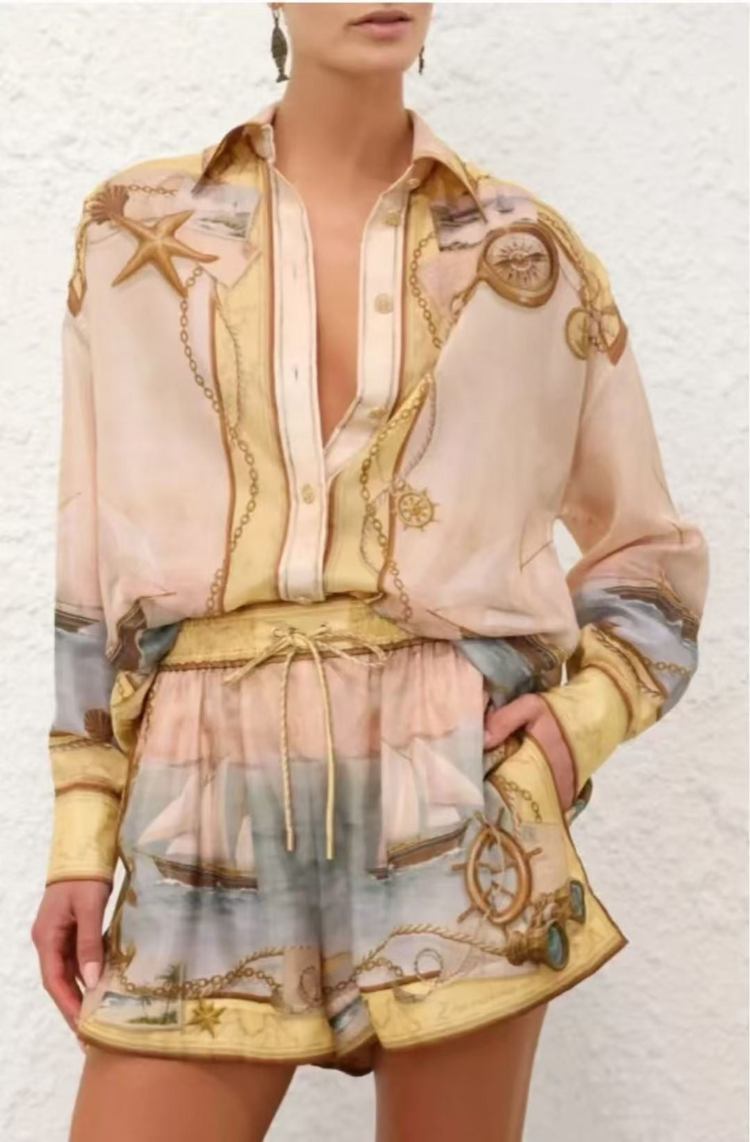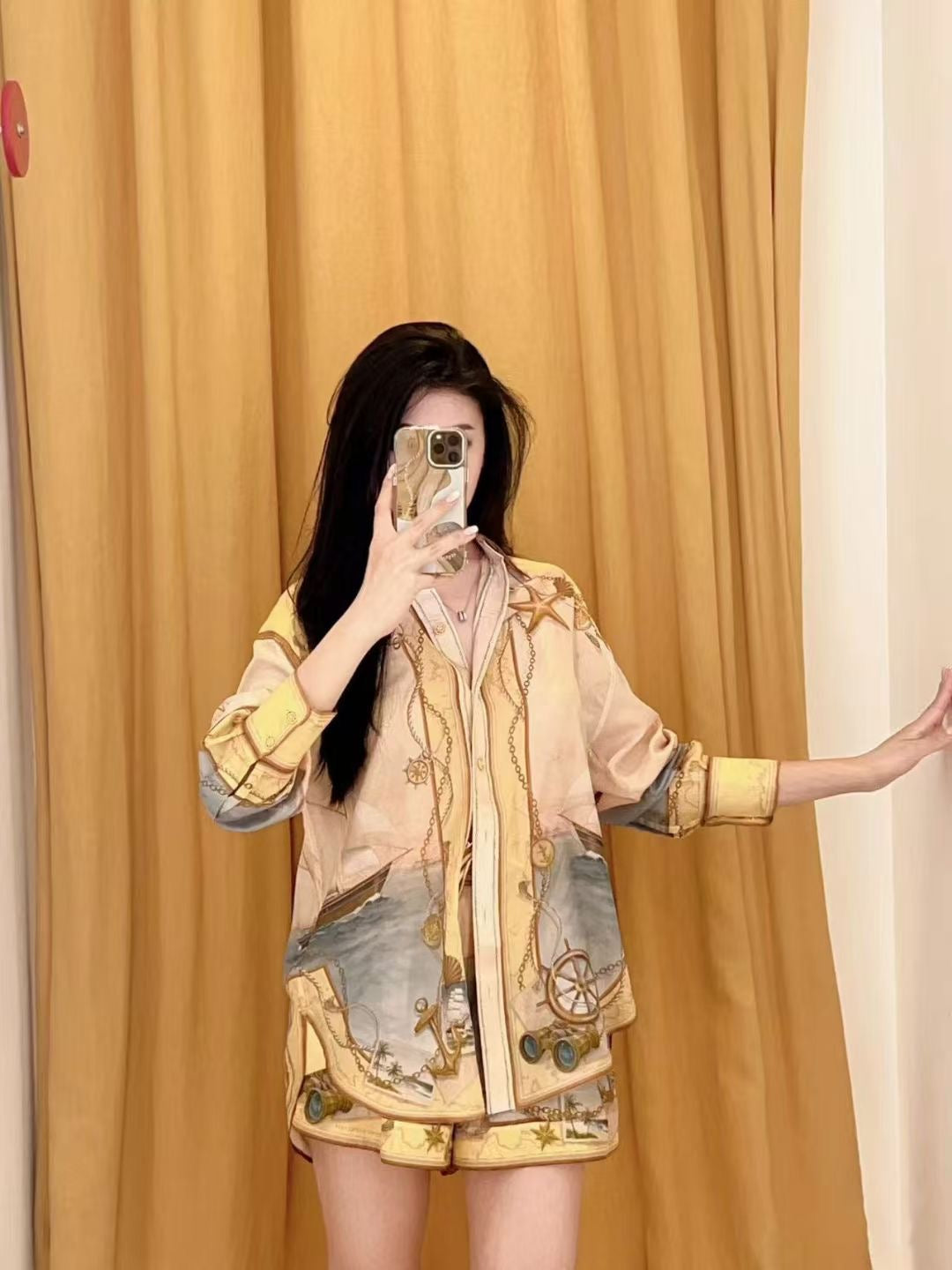 Set lụa quần sọt áo sơ mi hoạ tiết xe ngựa vàng cực xinh 6742