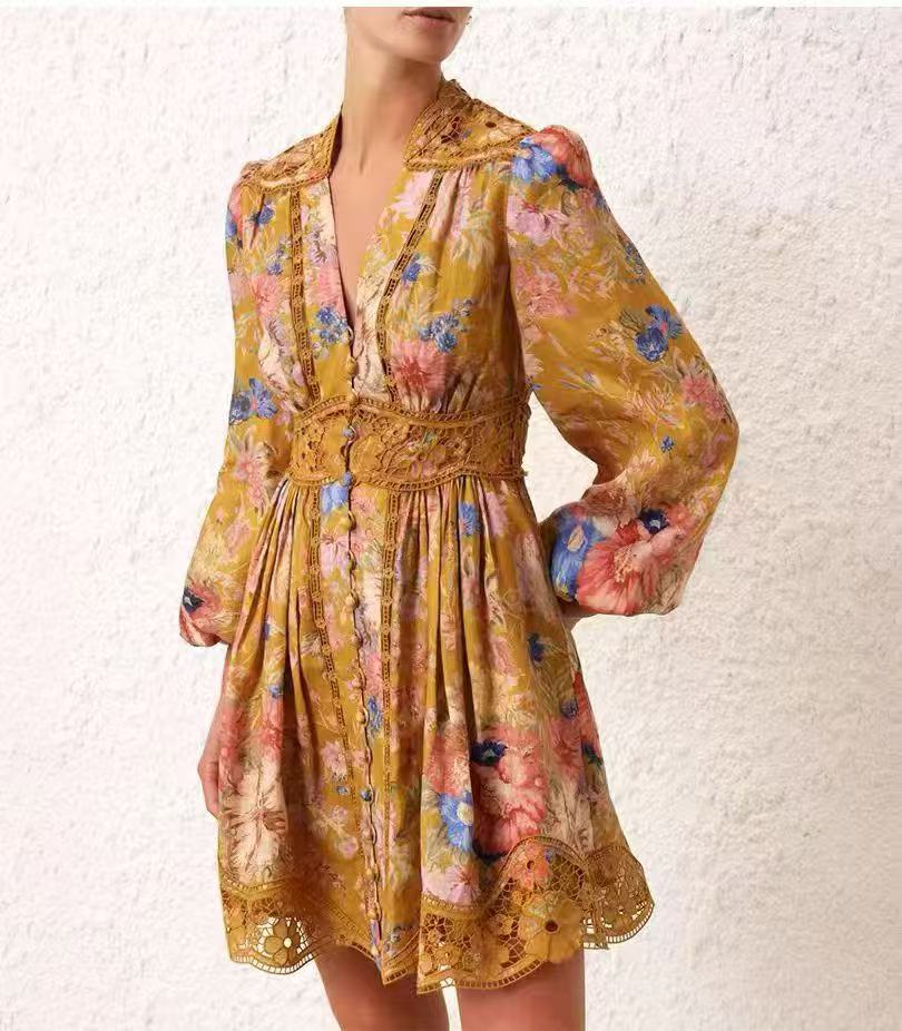 Đầm lụa ngắn tay dài cổ tim cài nút hoạ tiết vàng 6757