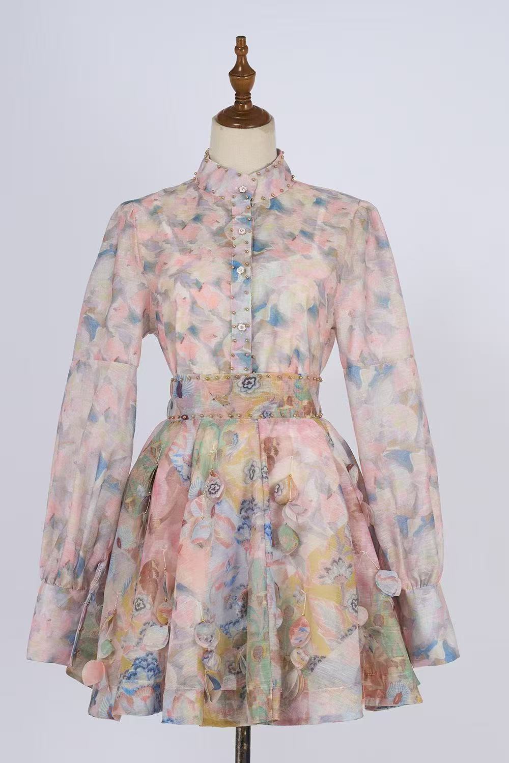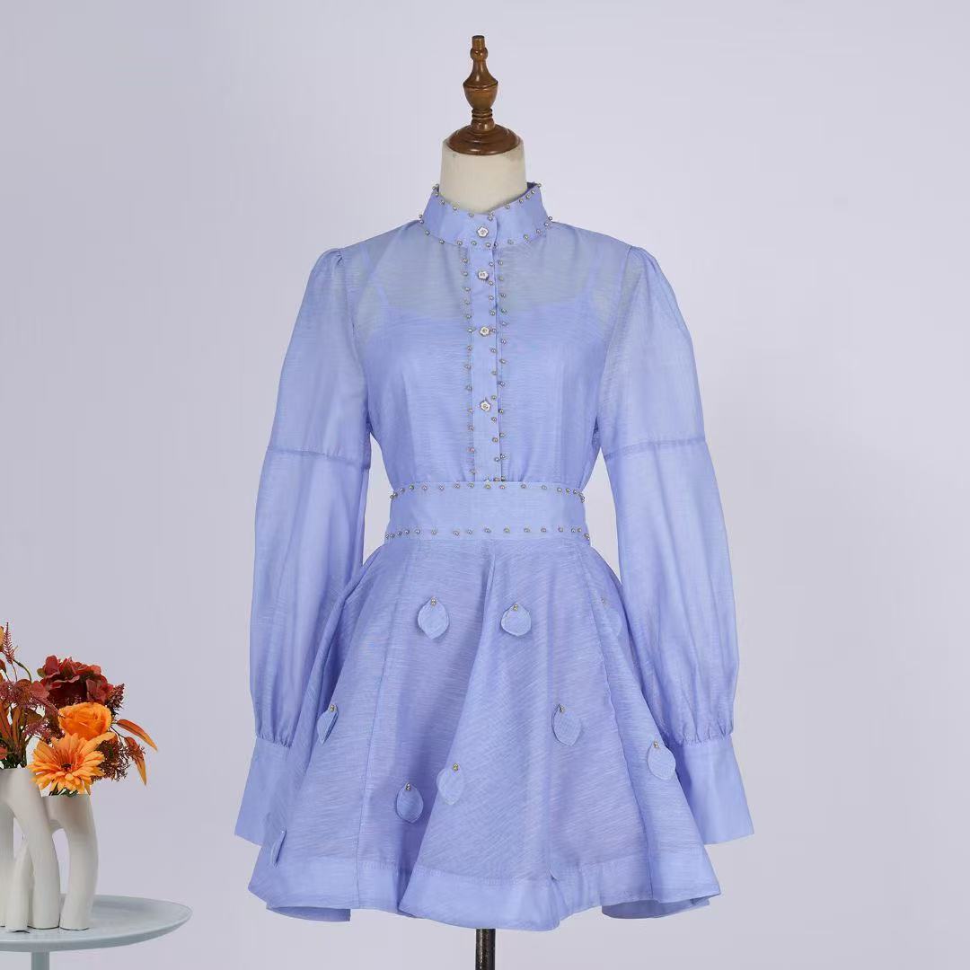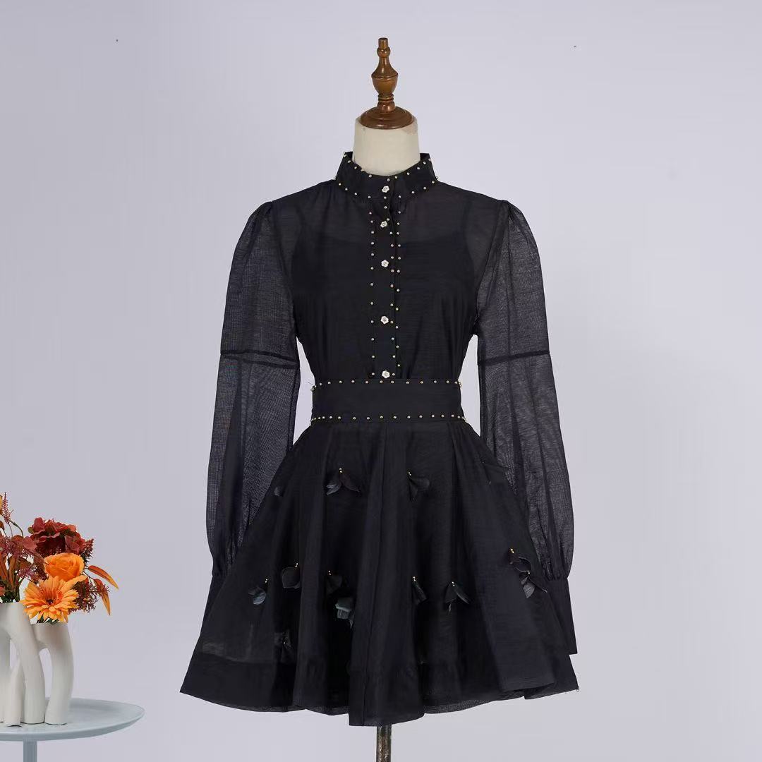 Set váy lụa ngắn xòe tay dài màu đen 6759