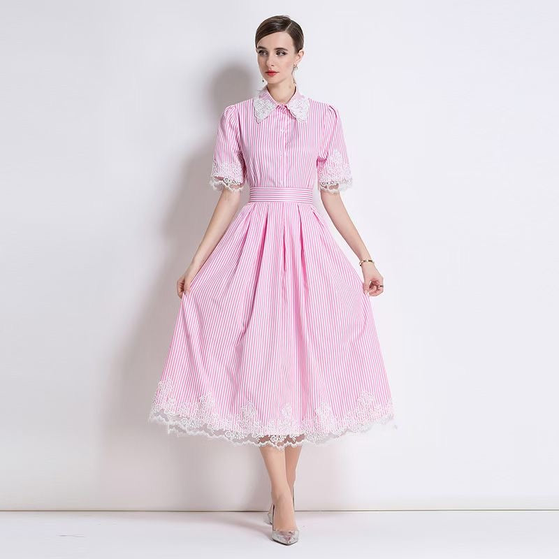 Set sọc nhỏ cổ sơ mi viền ren Màu Hồng 6785