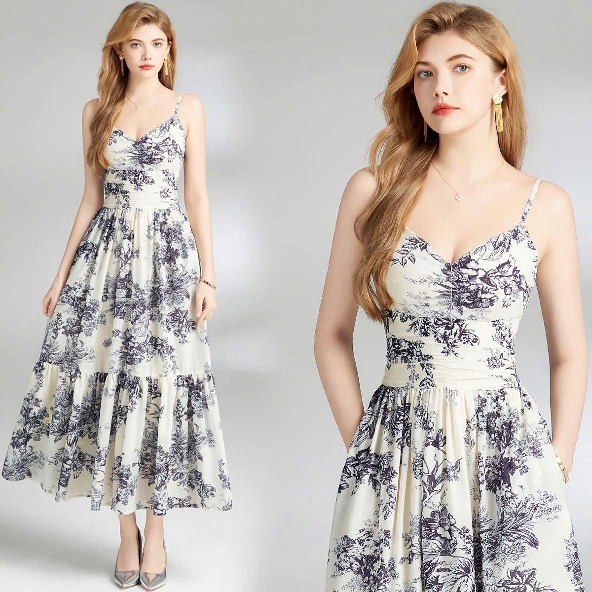 Đầm lụa 2 dây hoạ tiết CD 5850