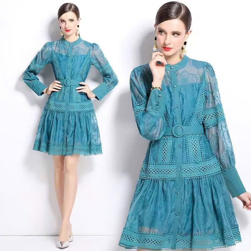 Đầm ren xanh cổ vịt kèm belt đẹp lạ 6365