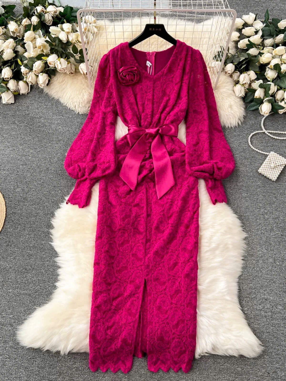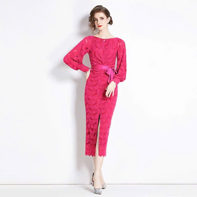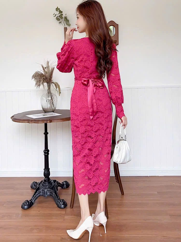 Đầm ren hồng sen dây cột eo mềm mại 6314