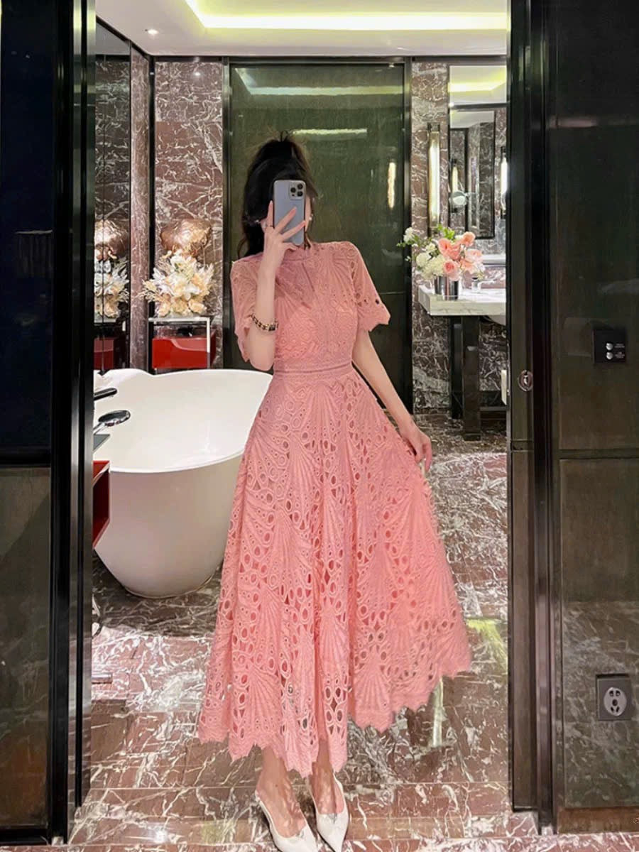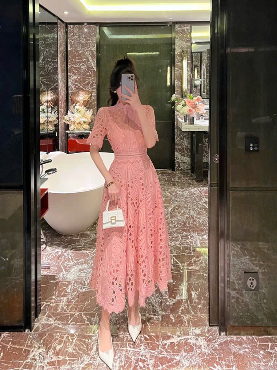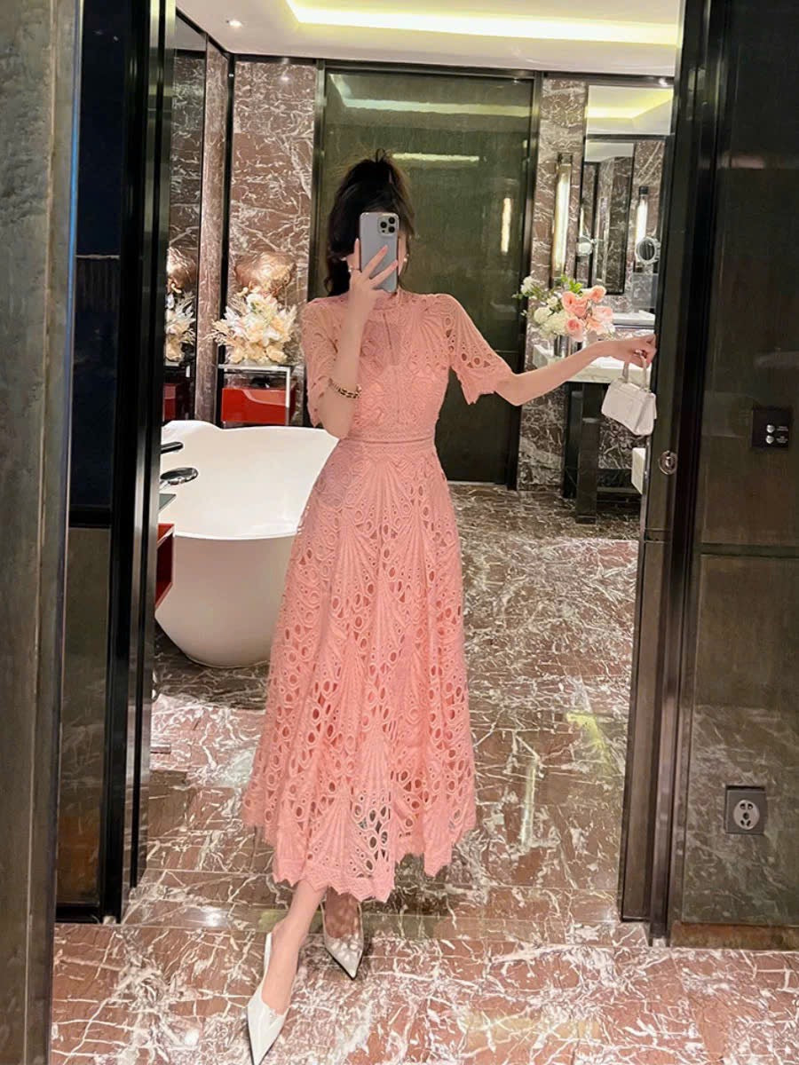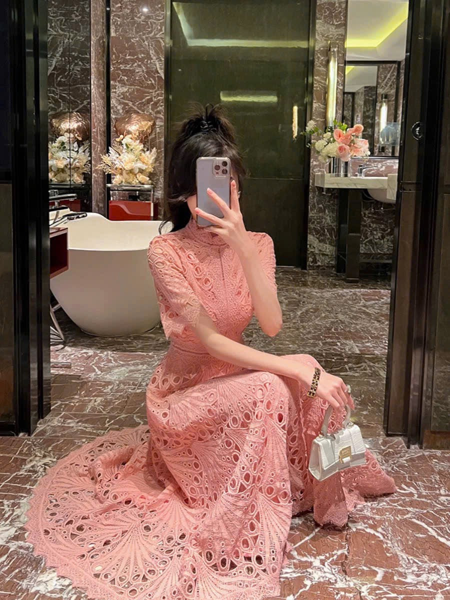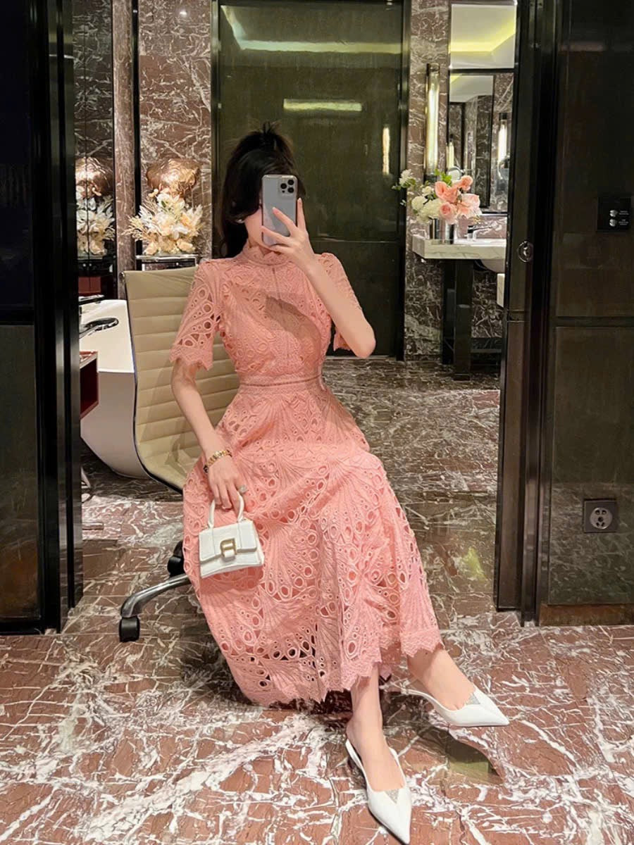 Đầm ren hồng cổ đứng form dài siêu đẹp 6061