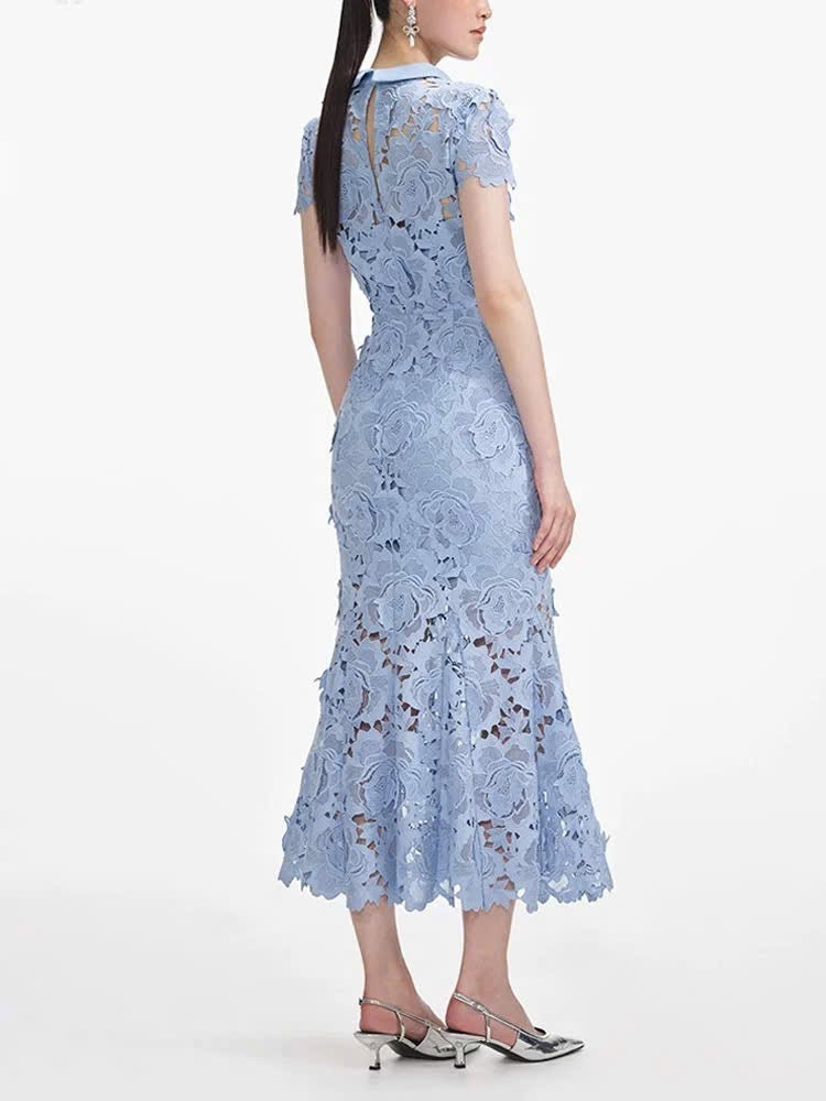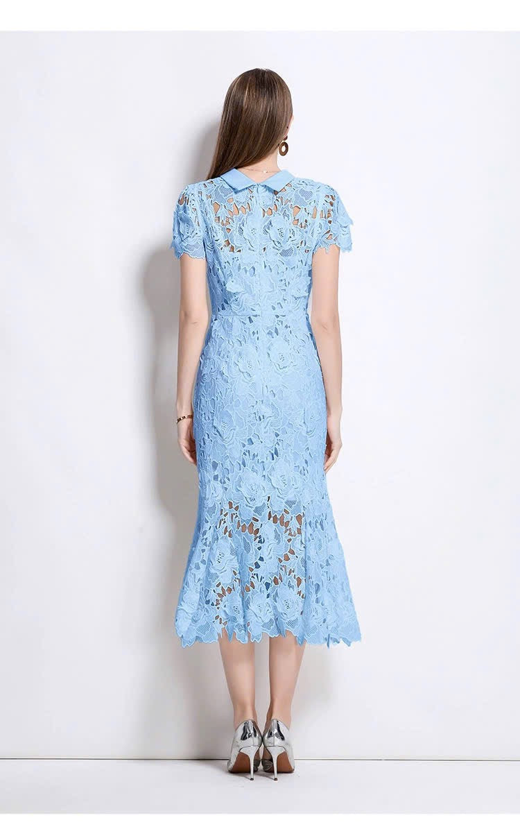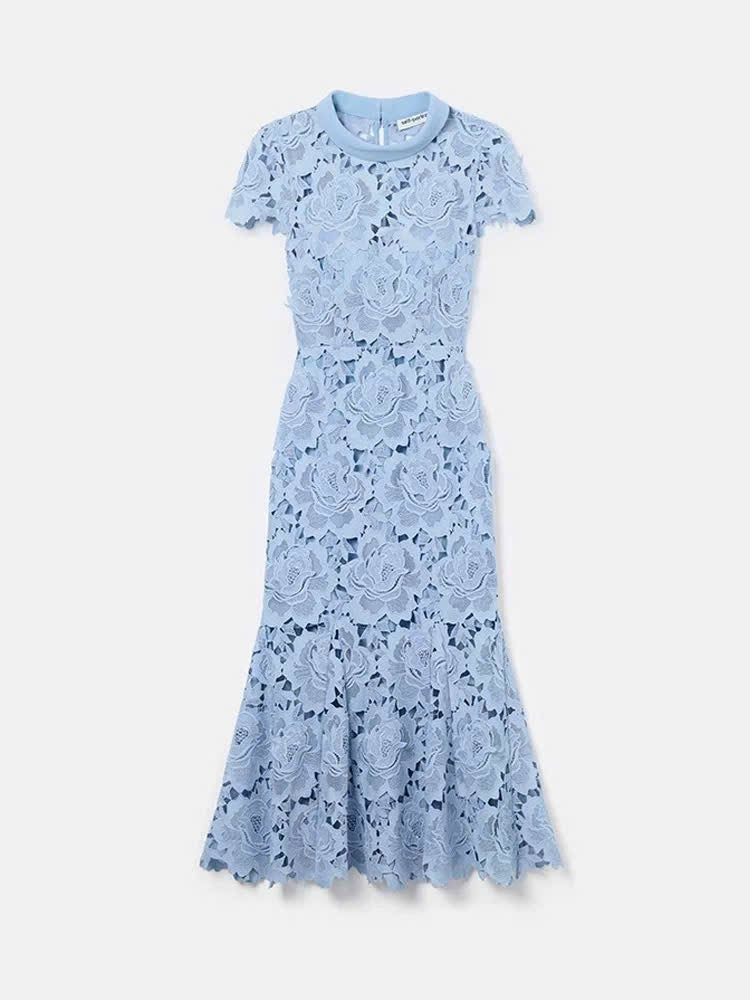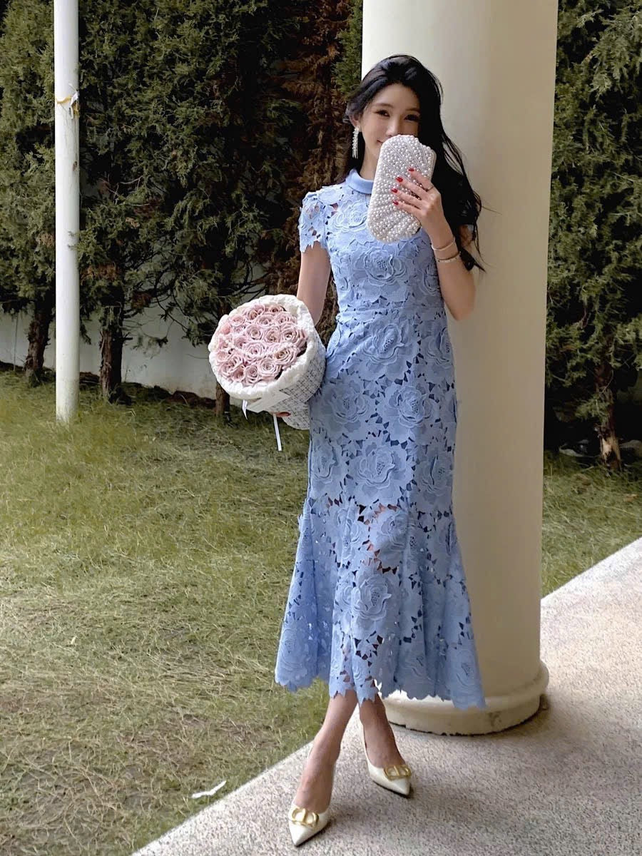 Đầm ren đuôi cá cổ đứng màu xanh dương 6055