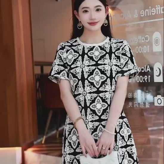 Đầm suông lụa 2 lớp hoạ tiết trắng đen đẹp 7471