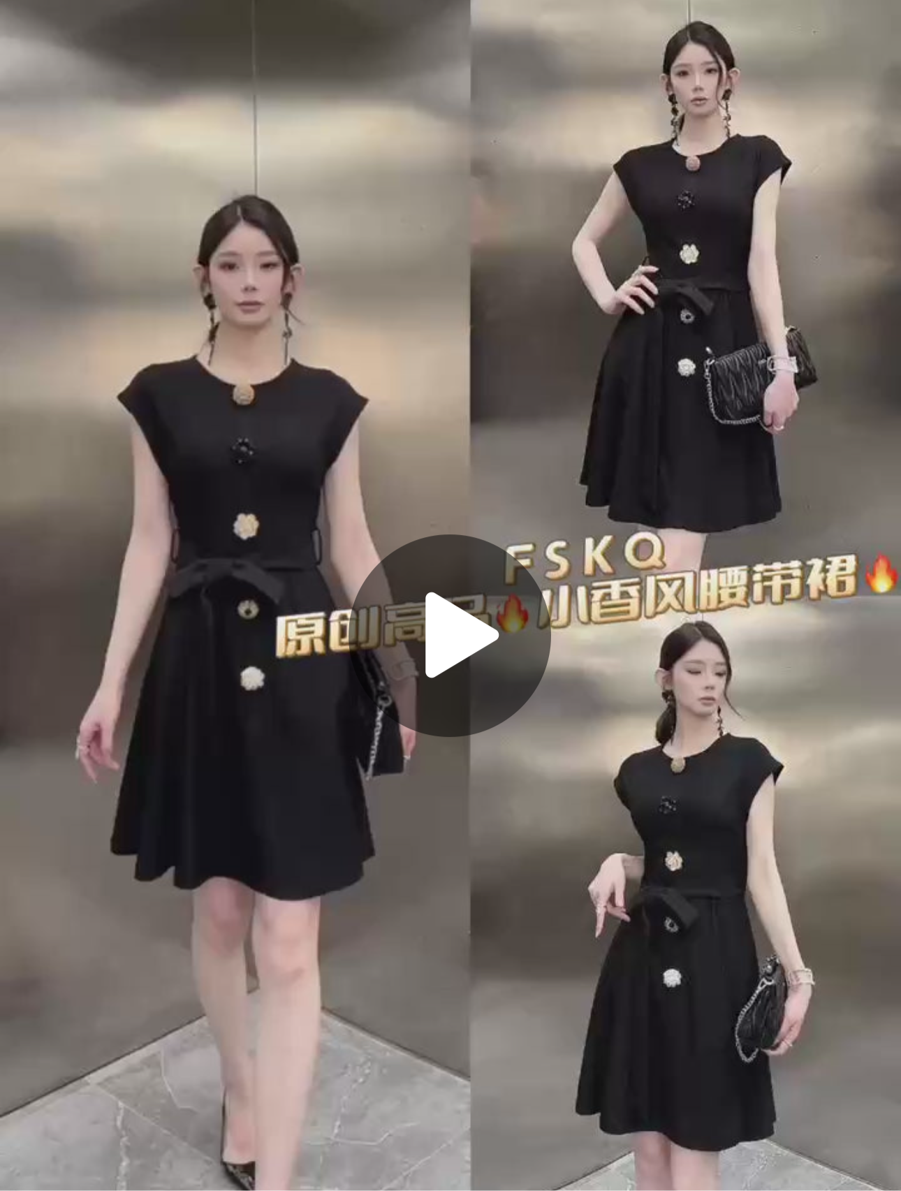 Đầm thun đen đính 5 bông hoa kèm dây cột eo 5550