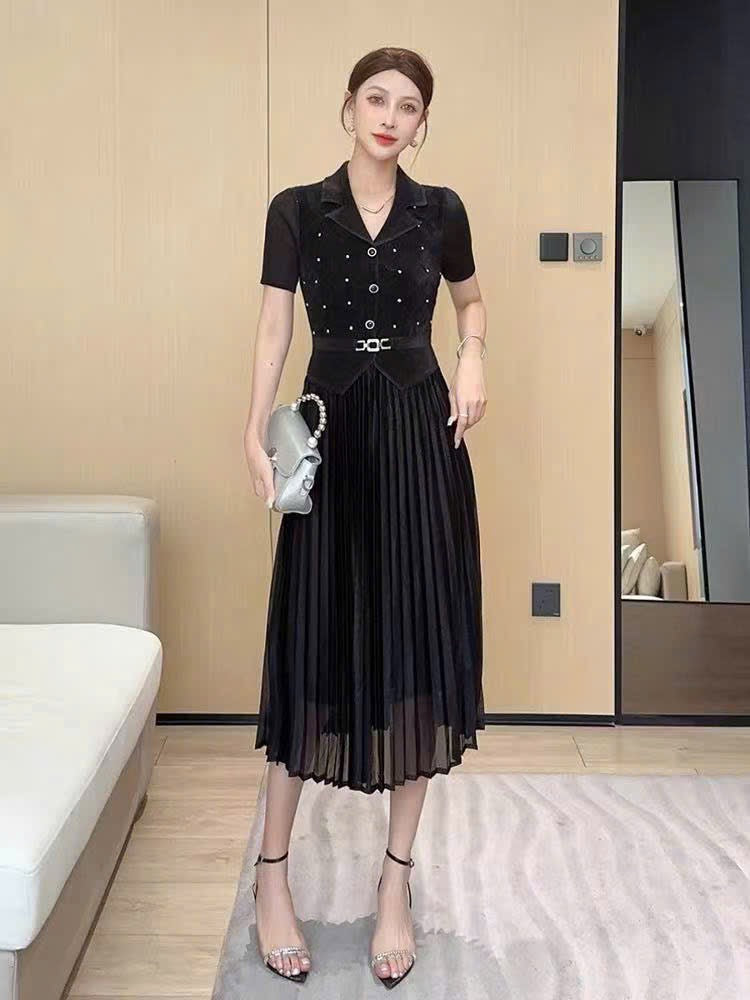 Đầm thun nhún cổ bẻ rất đẹp màu đen 6107