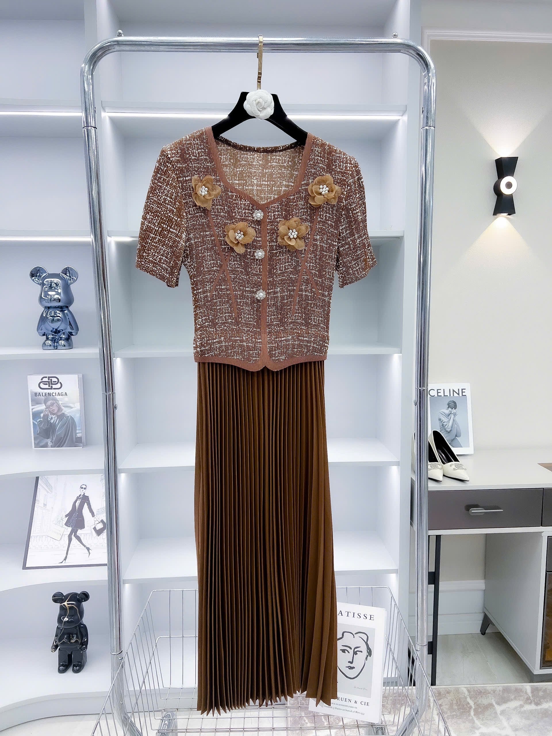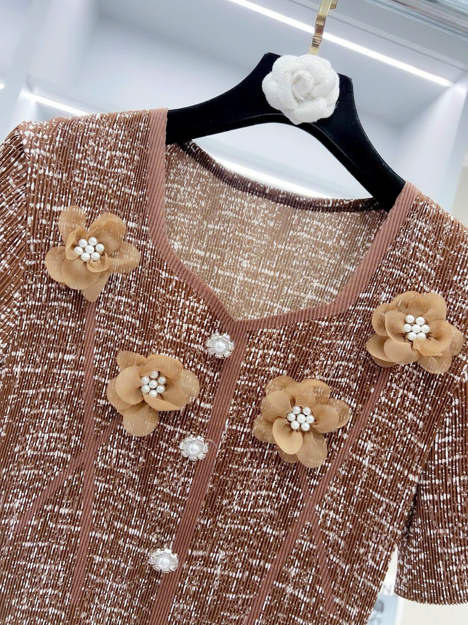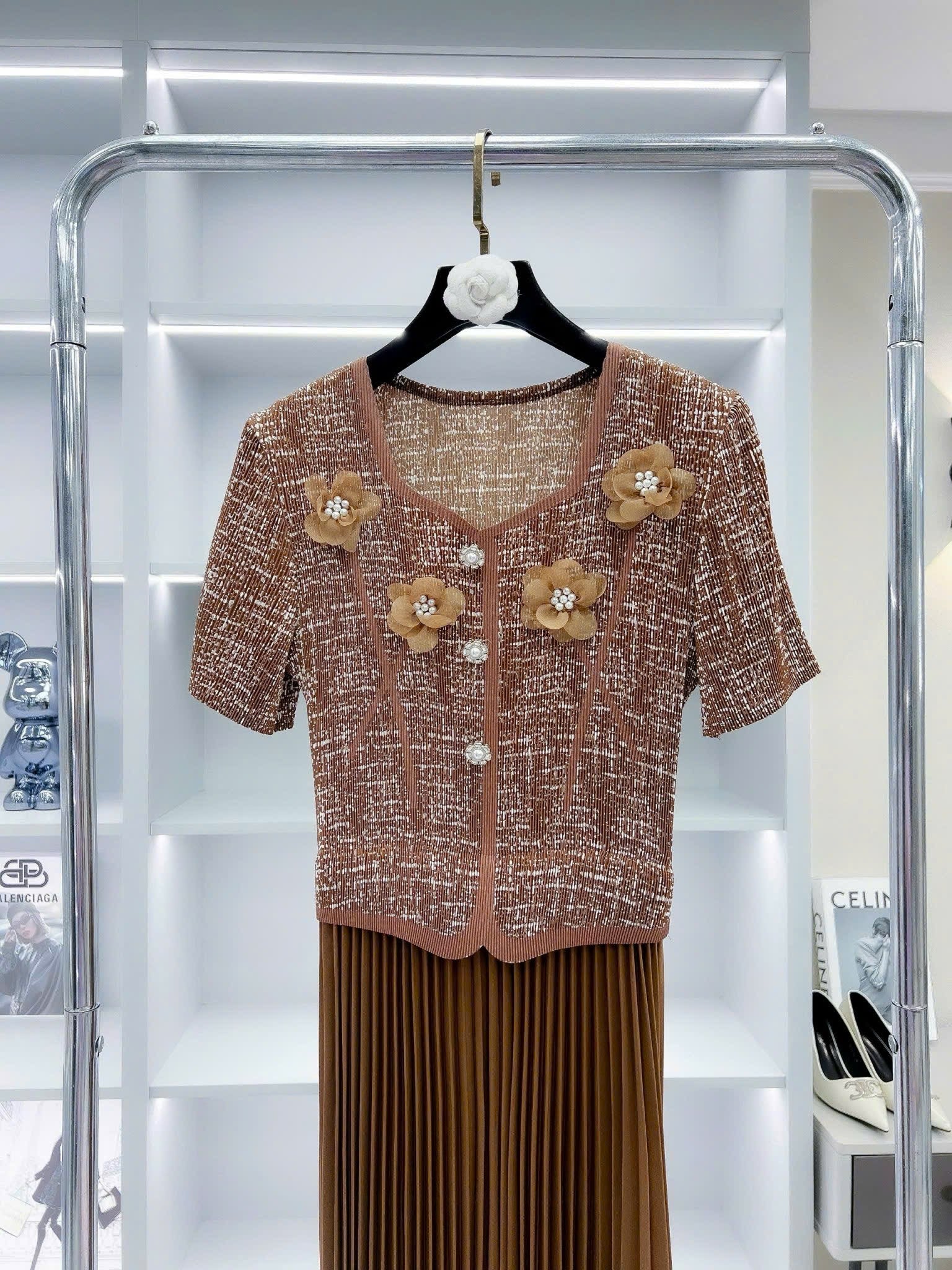 Đầm thun nhún đính bông hoa ngọc trai màu nâu 6053