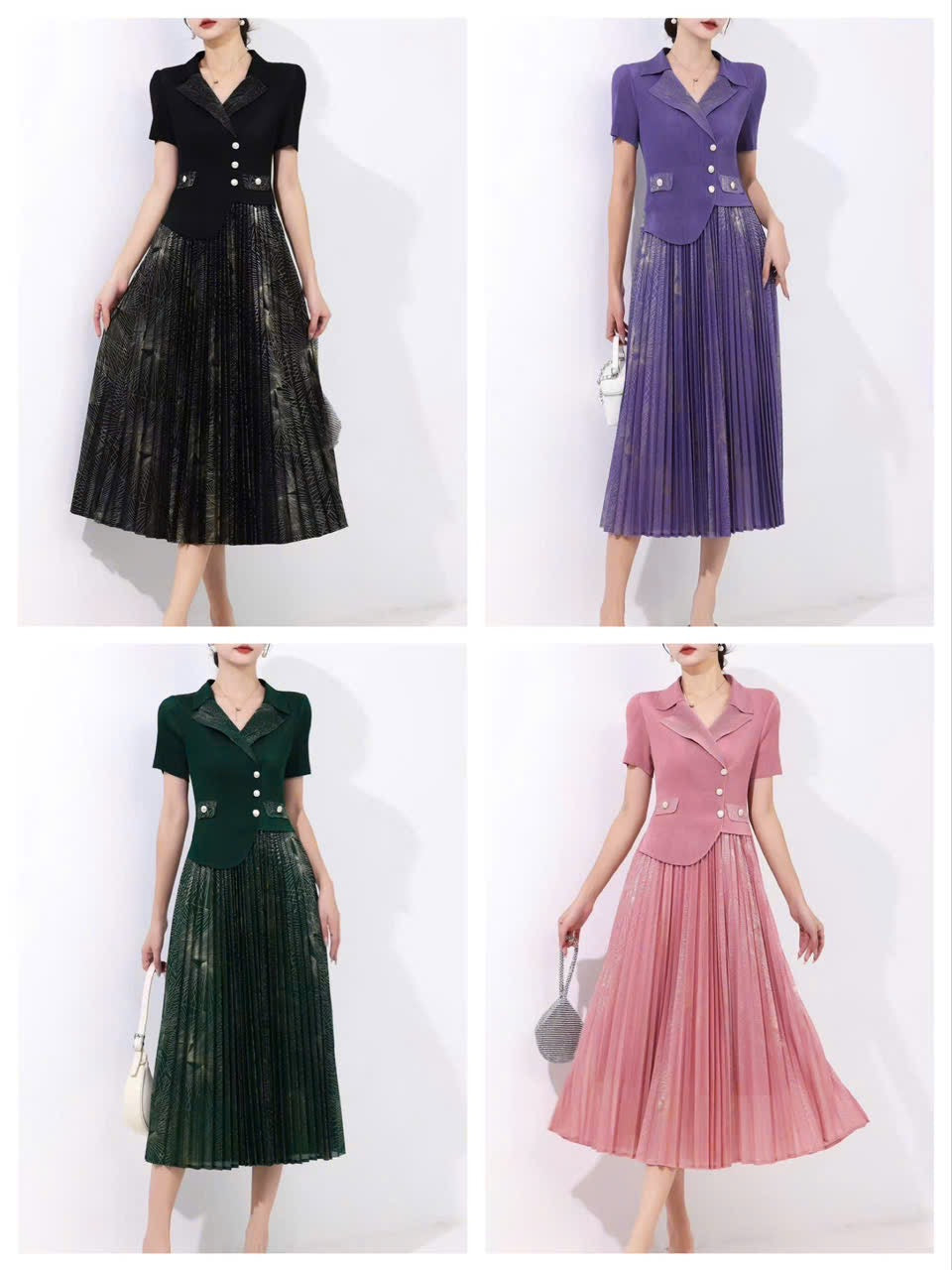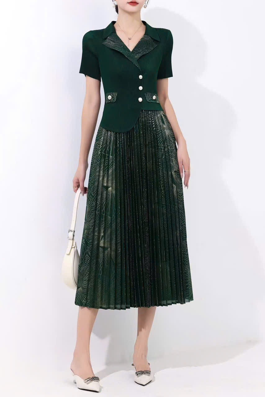 Đầm thun nhún xếp ly cổ vest màu Xanh Rêu 6058