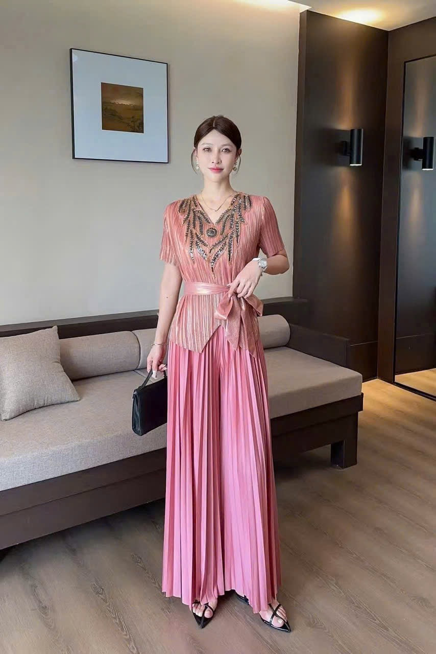 Sét thun nhún dính cườm sang trọng màu Hồng nhạt 6015